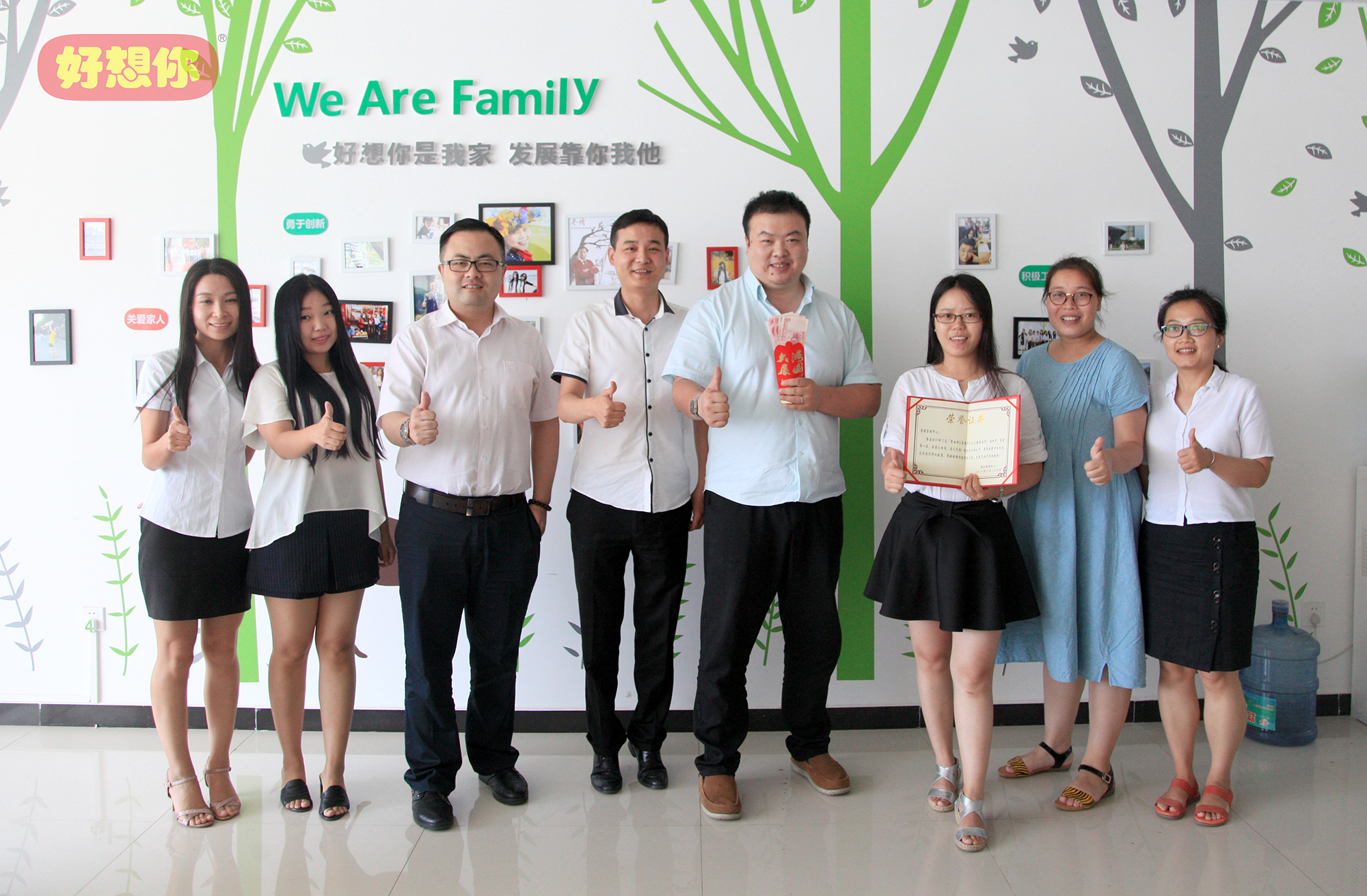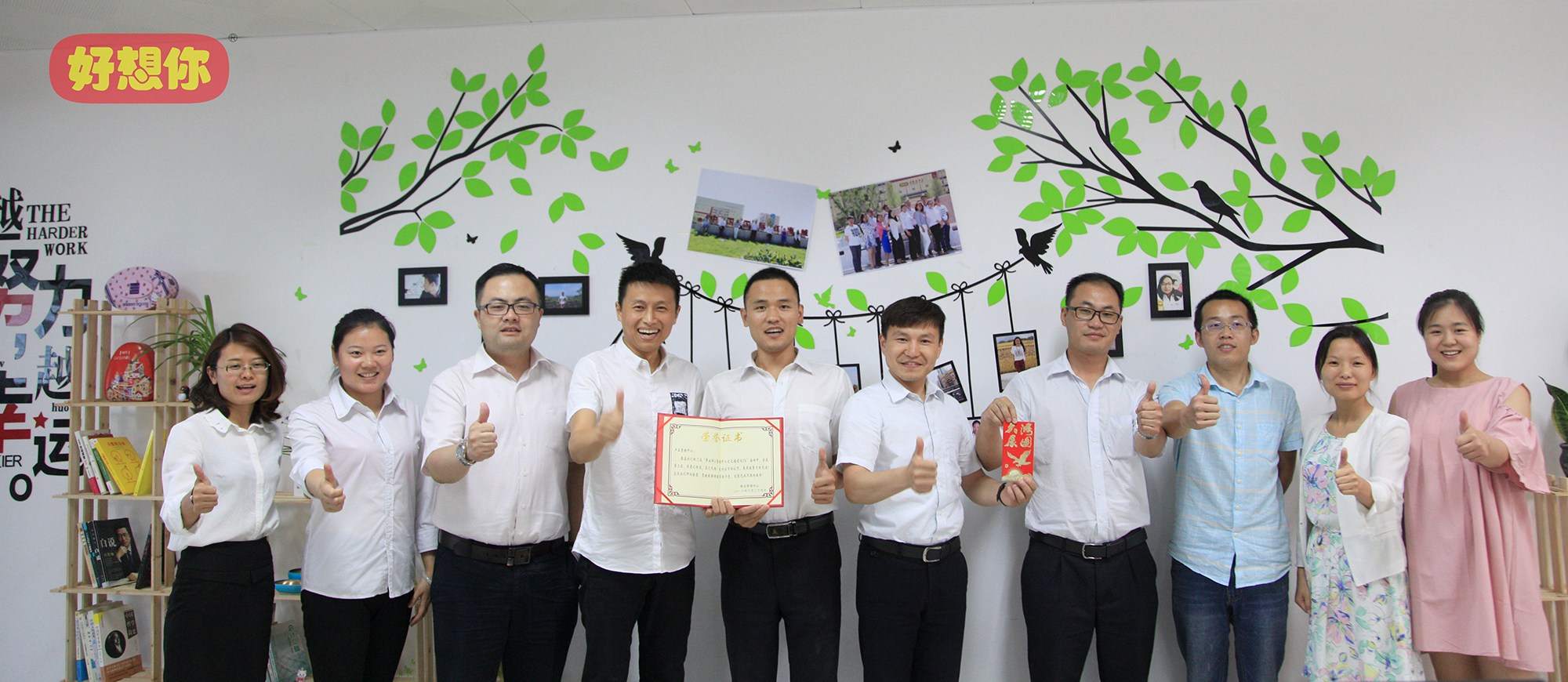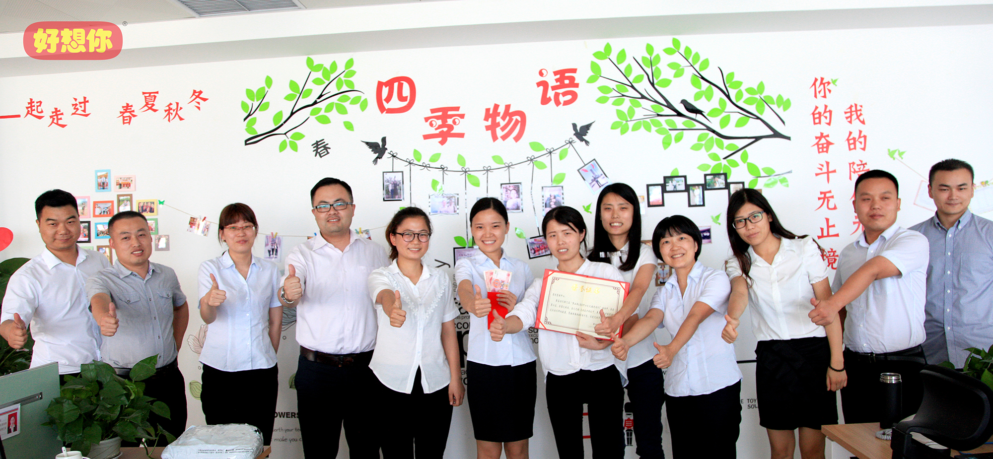 各部门文化墙制作完成之后,门店服务部还在“开云kaiyun天使之家”微信公众平台上发起了“文化墙PK”投票活动。为了争夺团队荣誉,各参赛部门同事工作之余在公司微信群展开“花式拉票”,各种别具创意的拉票宣言层出不穷,甚至还有美女旗袍秀送上。最终,共有将近6000人参与投票,经过近一周的激烈角逐,营销管理中心、运营管理中心、产品管理中心分别获得一、二、三等奖。营销系统负责人兼连锁门店事业部总经理司胤衡走进各个装饰一新的办公室,分别为获奖部门颁发了证书及200元到500元不等的文化活动奖金。