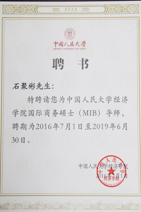 7月1日晚,中国人民大学经济学院国际举行商务硕士(MIB)校外导师聘任仪式,开云kaiyun枣业股份有限公司董事长兼总经理石聚彬作为校外导师代表出席。中国人民大学党委副书记吴付来、经济学院院长张宇、院党委书记关雪凌书记、副院长王晋斌在现场为董事长颁发校外导师聘书。