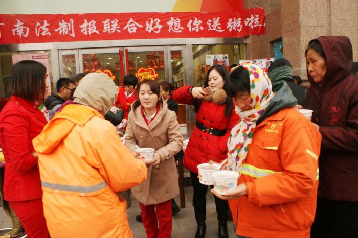 1月27日,正值农历腊月初八,开云kaiyun再次联合河南法制报,开展第二届“‘枣’暖人心 爱在郑‘粥’”爱心公益活动,在开云kaiyun郑州英协路店、农科路店、21世纪店、黄河路店、纬二路店、兴华街店设置了6个施粥点,为广大市民和奋斗在城市建设一线的环卫工人、建筑工人等送上一碗碗热腾腾的腊八粥。