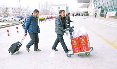 刘书显推着他的年货准备坐飞机回家,记者跟在后面。
