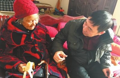 一下车,刘书显急着往屋里看,90岁的老娘耳朵有点聋,她此前并不知道儿子今天要回去,猛一下看到儿子,亲得拉住手不知说啥是好,刘书显赶紧给母亲剥个香蕉:“娘,你吃。”
